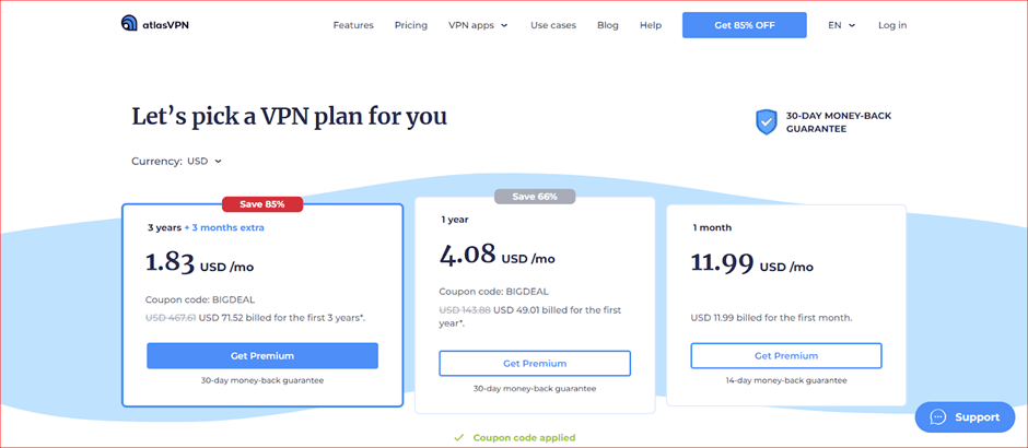 If you are considering Atlas VPN, there is a coupon provided for you to take advantage of a generous discount. Additionally, all plans come with a comprehensive 30-day money-back guarantee.
