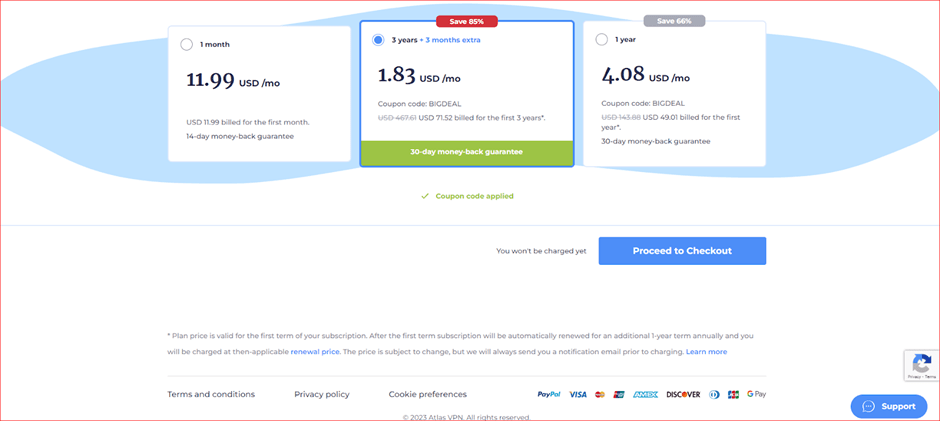 - 3-year: The 3-year plan is the most impressive pricing option that makes Atlas VPN stand out. You can opt for this plan because Atlas offers it for $1.83/month plus a 3-month extra.